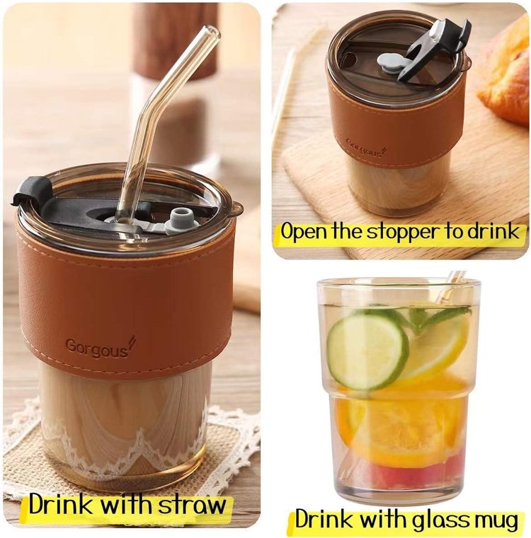 Modern Design Travel Milk Coffee Straw Drinking Tumbler Cup Reusable Clear Borosilicate Glass Mugs with Leather Sleeve